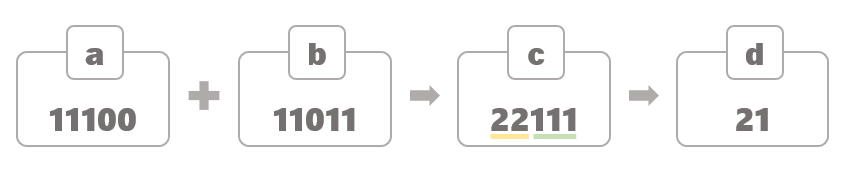 예시를 하나 더 보겠다. a와 b를 더하니 22111이 나왔다. 여기에서 연속된 숫자들은 없애니 21이 나온다.