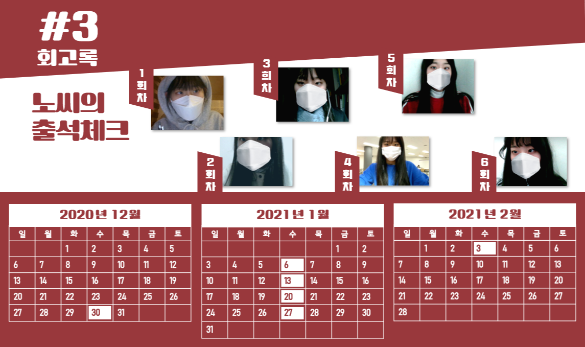 출석현황을 보겠다. 완벽하다. 6회차 모두 꼬박꼬박 참여했다.