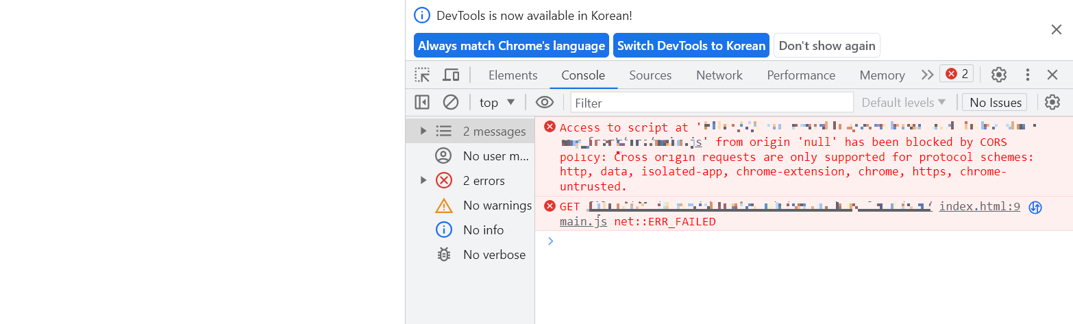 해당 오류 메시지에서 나타난 'null'은 웹 페이지가 로컬 파일 시스템에서 로드되었음을 나타냅니다. 이는 보통 로컬에서 HTML 파일을 직접 더블 클릭하여 브라우저에서 열었을 때 발생하는 상황입니다.