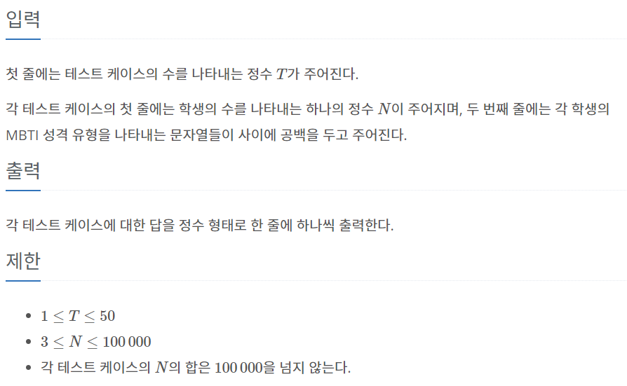 이 원리를 문제에 적용해보자. (16*3+1) 이상의 사람이 입력되면, 적어도 MBTI가 똑같은 사람이 3명 이상 있다.